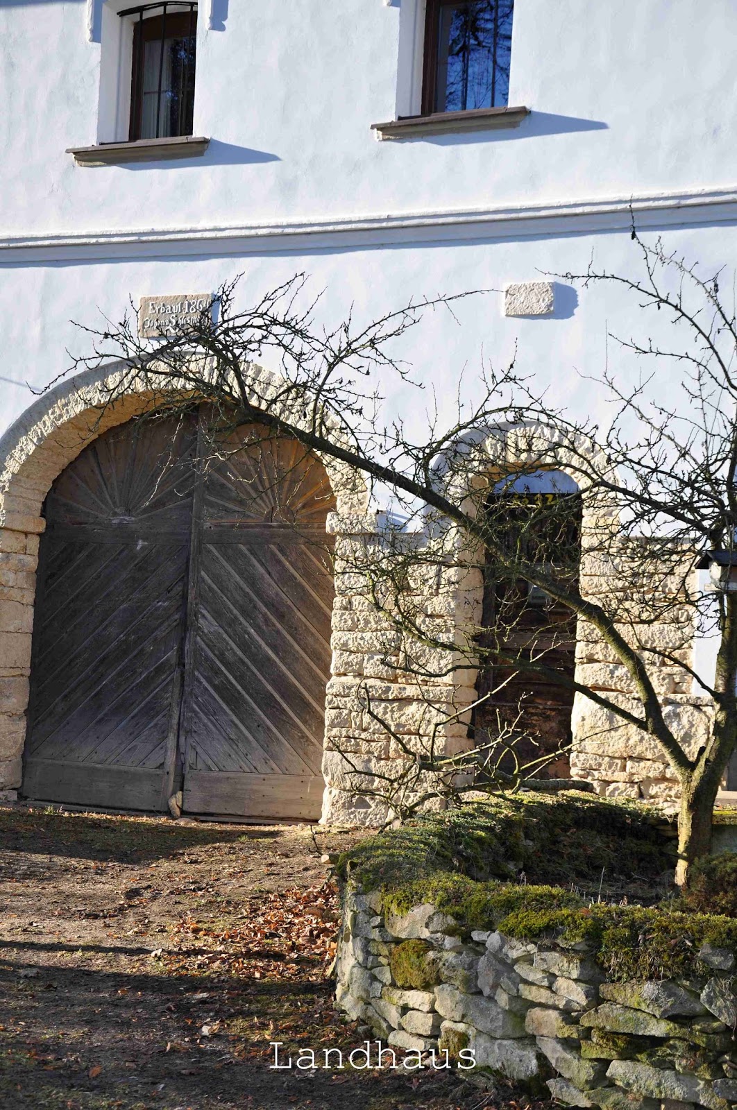 Vrátka zdobí volně uvázaný svazek jehličnanů, jmelí a dřínu .